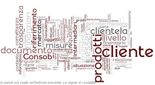 Quest’ultime, invece, sono le parole più frequenti nell’articolo precedente a questo: “Le regole di condotta (misure di livello 3) che l’intermediario finanziario deve rispettare in sede di collocamento di prodotti finanziari. Il documento della Consob tra MiFID e TUF“.