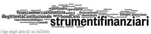 Ad esempio, come è intuibile, attualmente su inDiritto ci siamo occupati molto degli Strumenti finanziari, (viste, peraltro, le recenti novità introdotte), ed in tal senso in basso a destra potete vedere che negli “Argomenti di inDiritto” il tag “Strumenti finanziari” risulta essere visivamente con un carattere più grande degli altri dell’elenco.